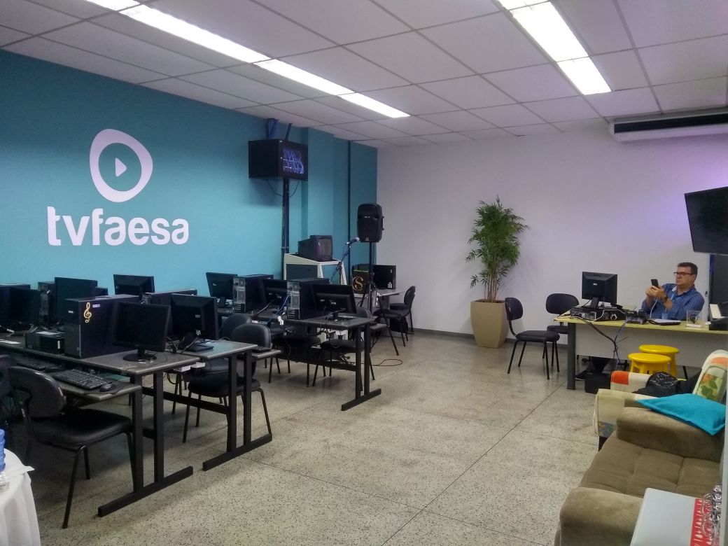 Dentre os projetos de extensão oferecidos aos alunos dos cursos de Comunicação Social da FAESA está a TV FAESA, criada há 19 anos. Mesmo com excelentes produtos audiovisuais lançados, a redação da TV pedia uma cara nova. Foi aí que o estudante e estagiário Pedro Amâncio entrou em cena como porta voz do grupo: aproveitou uma visita do Magnífico Reitor Alexandre Nunes Theodoro à redação e solicitou “um banho de tinta”. O resultado não poderia ter sido melhor, o novo espaço ficou incrível.