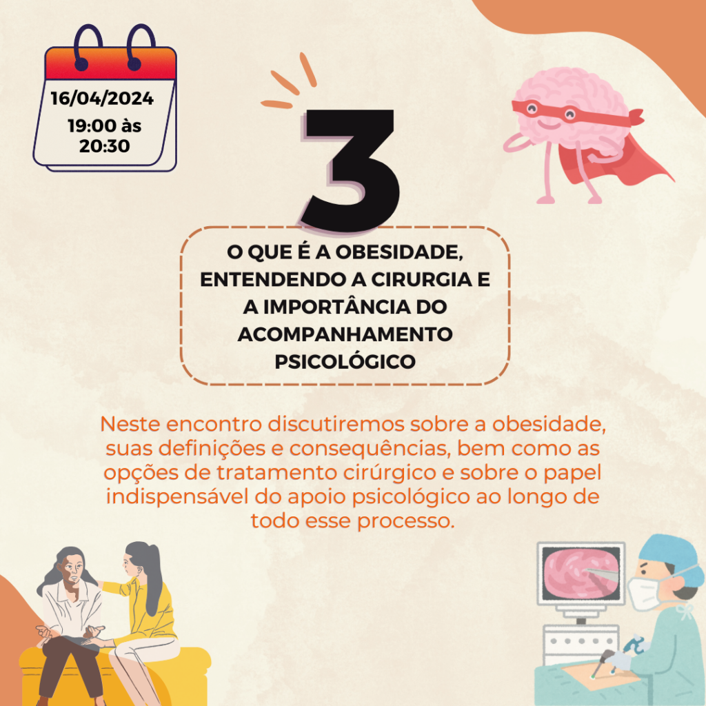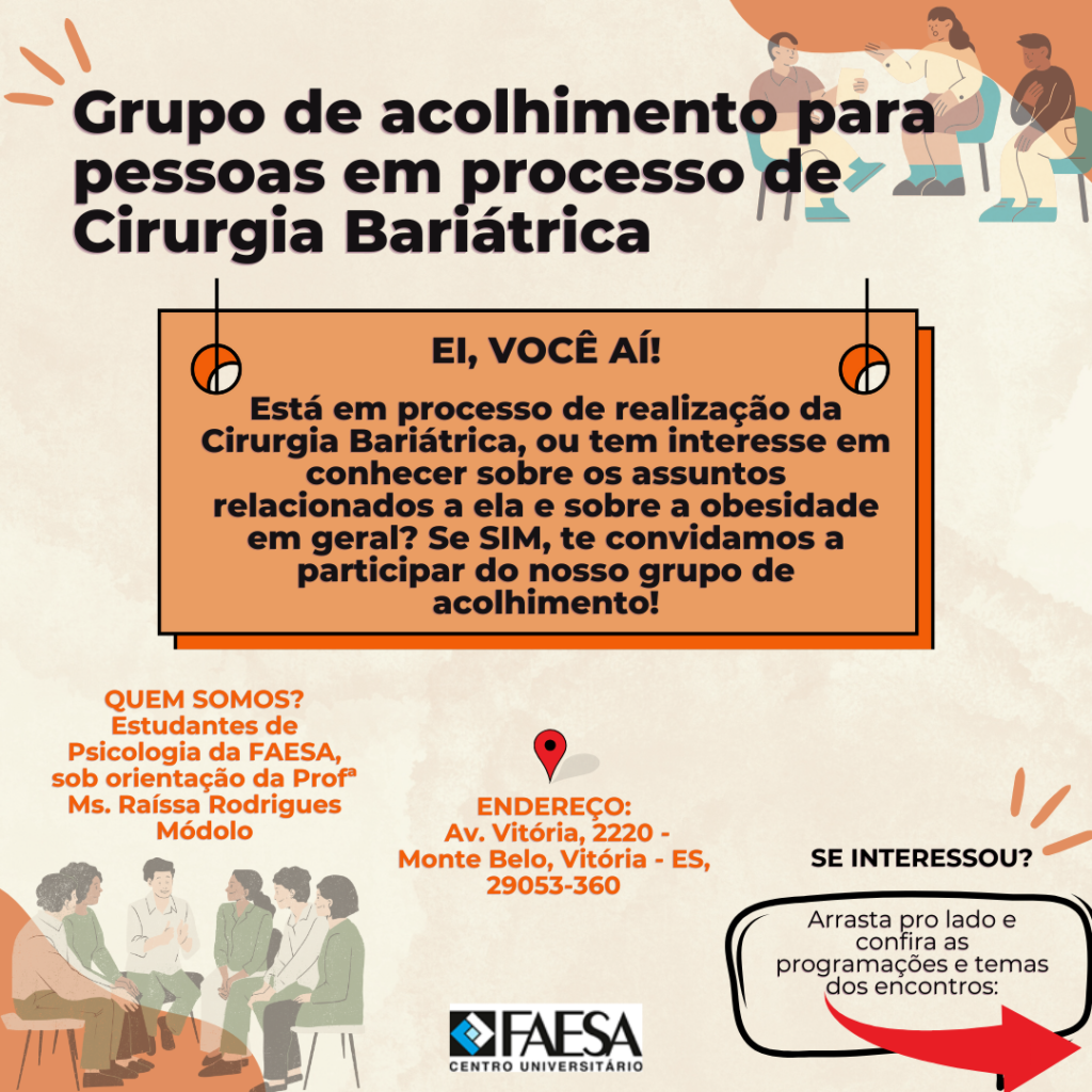 No intuito de oferecer suporte e preparação adequada para pacientes que estão prestes a passar pelo processo de cirurgia bariátrica, alunos do 7º Período de Psicologia da FAESA lançam grupo de acolhimento. Serão realizados oito encontros semanais, às terças-feiras, das 19 horas às 20h30, na própria Instituição, abordando diferentes temas relacionados à obesidade e à cirurgia. E o primeiro encontro será, hoje (02/04), na sala 414.