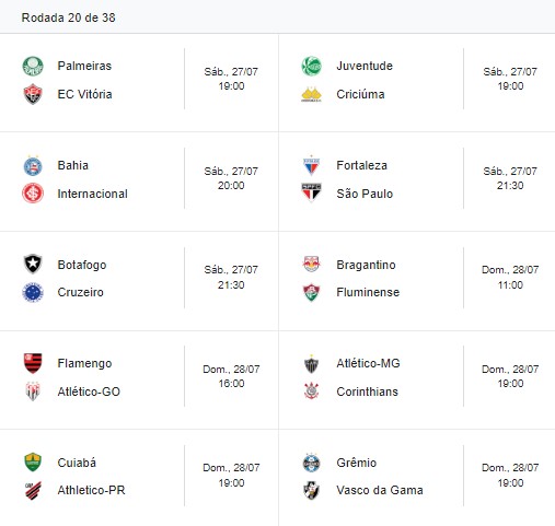 Confira as partidas válidas pela 20ª rodada do Brasileirão: