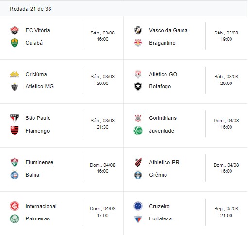 Confira as partidas válidas pela 21ª rodada do Brasileirão: