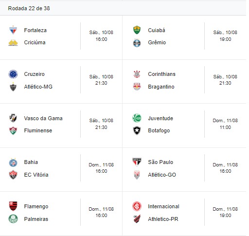 Confira as partidas válidas pela 22ª rodada do Brasileirão: