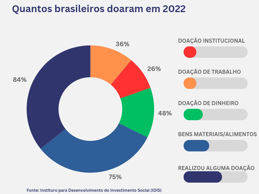 Cerca de 63% dos brasileiros afirmaram ter ajudado pessoas que não conheciam, enquanto 26% doaram dinheiro e apenas 15% participaram de atividades voluntárias. Esses dados apontam para um país solidário, mas que ainda enfrenta desafios para consolidar uma cultura de doação sistemática.