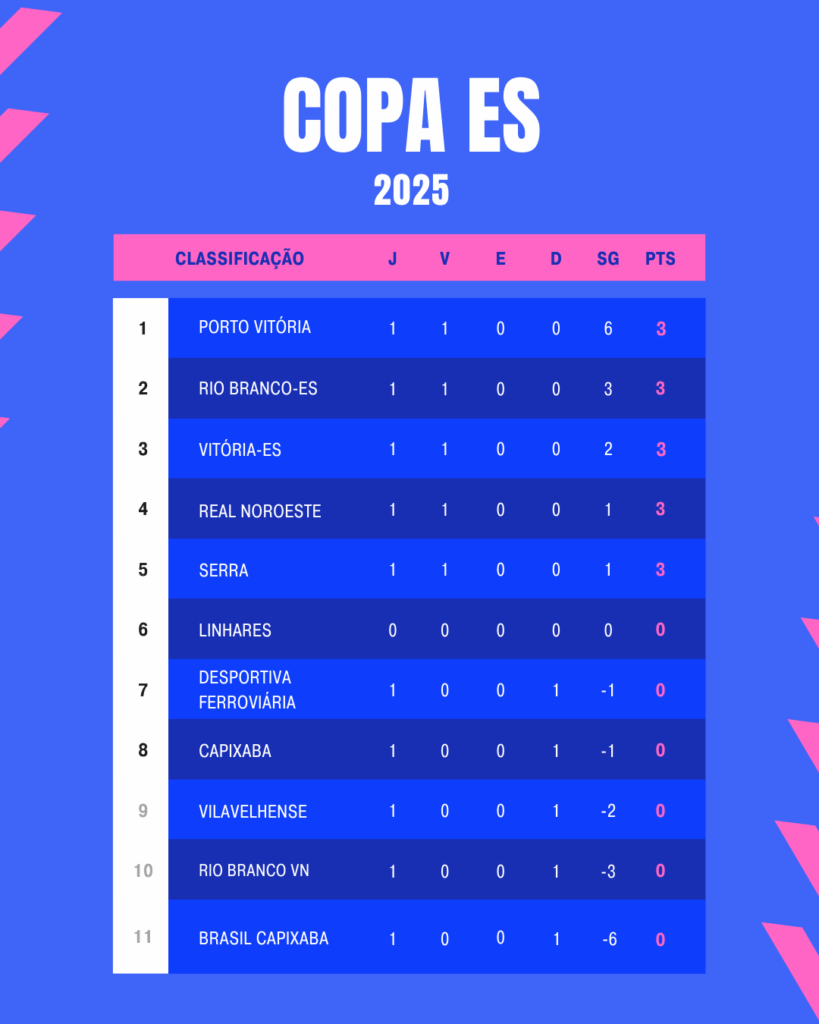 A Copa ES começou no sábado (19). A competição é disputada por 11 equipes, e premia o campeão com vaga para a Série D do Campeonato Brasileiro de 2026.