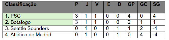 Já pelo Grupo B, no domingo (15), PSG x Atlético de Madrid iniciaram o dia com um show do time francês. Dominante como na final da Champions League, o PSG sufocou o clube espanhol do início ao fim e goleu o Atlético de Madrid por 4 x 0. Fabián Ruiz, Vitinha, Mayulu e Lee marcaram para os atuais campeões da europa. Também no domingo (15), o Botafogo estreou no Mundial com o pé direito. O Alvinegro venceu o Seattle Sounders por 2 x 1. Jair abriu o placar em Seattle, de cabeça, fazendo seu primeiro gol como profissional. Igor Jesus ampliou ainda na primeira etapa, também de cabeça. No segundo tempo, o Botafogo caiu de rendimento e o Seattle cresceu na partida, diminuindo o placar com Cristian Roldán. Os americanos levaram muito perigo até o último minuto de jogo, mas John salvou o Fogão e segurou a vitória na estreia.