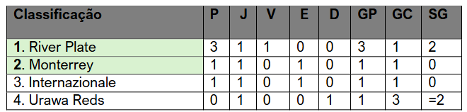 Nos jogos válidos pelo Grupo E, o River Plate fez uma partida segura e venceu o Urawa Reds por 3 x 1 em Seattle, na terça-feira (17). Os gols da equipe argentina foram marcados por Colidio, Driussi e Meza. O gol da equipe japonesa foi marcado por Matsuo, em cobrança de pênalti. Finalizando o grupo E, Monterrey x Inter de Milão se enfrentaram no Rose Bowl, terça (17), e o clube mexicano surpreendeu. Após cobrança de escanteio, Sérgio Ramos, de cabeça, abriu o placar para o time mexicano. Os italianos foram pra cima em busca do empate e, ainda na primeira etapa, Lautaro Martínez empatou o duelo.