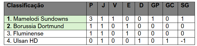 No Grupo F, Fluminense x Borussia Dortmund se enfrentaram terça (17) em Nova Jersey e o Tricolor protagonizou uma grande partida, sendo superior desde o primeiro minuto do jogo. A equipe brasileira empilhou chances durante a partida, mas parou em Kobel, goleiro do clube alemão. A chance mais clara do Flu foi com Everaldo, que ficou cara a cara com o goleiro, mas acabou optando pela decisão errada e desperdiçou uma grande chance de decidir a partida. O Tricolor Carioca ainda teve uma grande chance com Nonato, após chute de Everaldo, mas o meia parou em mais uma bela defesa de Kobel. O duelo terminou em 0 x 0. No outro jogo do grupo, terça (17), em Orlando, o Mamelodi Sundowns venceu o Ulsan por 1 x 0, com gol marcado por Rayners.