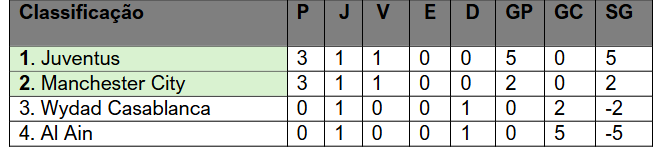 Pelo Grupo G, Manchester City x Wydad Casablanca se enfrentaram quarta-feira (18), na Filadélfia. Phil Foden abriu o placar para os Cityzens com apenas 1 minuto e 52 segundos de partida. Ainda no primeiro tempo, Doku ampliou a vantagem para os ingleses e fechou o placar. Estreia com vitória de 2 x 0 do City pra cima dos marroquinos. Fechando o grupo G, Al Ain x Juventus se enfrentaram no Buzzard Point, na quarta-feira (18), e os italianos não tomaram conhecimento do time dos Emirados Árabes. Os gols da equipe italiana foram marcados por Francisco Conceição (2x), Kolo Muani (2x) e Yildiz, fechando a goleada por 5 x 0.