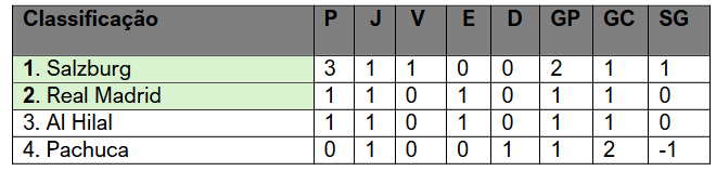 Fechando a primeira fase, pelo Grupo H, Real Madrid x Al Hilal se enfrentaram em Miami, quarta-feira (18). Em início de jogo equilibrado, o time espanhol saiu na frente no primeiro tempo com Gonzalo García. Mas, ainda na primeira etapa, a equipe saudita empatou após o juiz marcar pênalti de Asencio em Marcos Leonardo. Na cobrança, Rúben Neves deixou tudo igual. Após uma segunda etapa também equilibrada, a equipe espanhola teve um pênalti marcado a seu favor no último minuto. Valverde foi para a cobrança e parou no goleiro marroquino Bono, finalizando a partida em 1 x 1. Fechando o grupo H, o Salzburg venceu o Pachuca, no TQL Stadium, também na quarta (18). Gloukh abriu o placar para os austríacos após uma linda jogada. Bryan González empatou no início do segundo tempo para os mexicanos, mas Onisiwo garantiu a vitória para o Salzburg por 2 x 1.