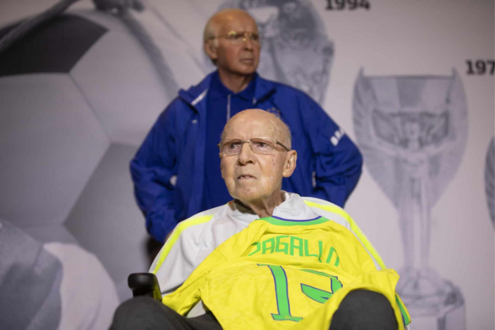 Zagallo posa com estátua que celebra legado histórico no futebol. (Foto: Lucas Figueiredo/Fotos Públicas)