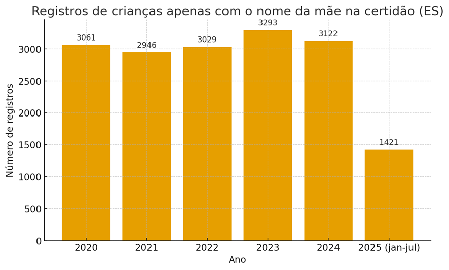 No Espírito Santo, de 2020 a 2024, foram registrados exatamente 15.451 casos de crianças com o nome apenas da mãe na certidão de nascimento, segundo dados do Sindicato dos Notários e Registradores do Espírito Santo (SINOREG-ES). Esses números revelam que a ausência da paternidade no registro civil vai muito além de uma questão burocrática: trata-se de um problema social que atravessa gerações.