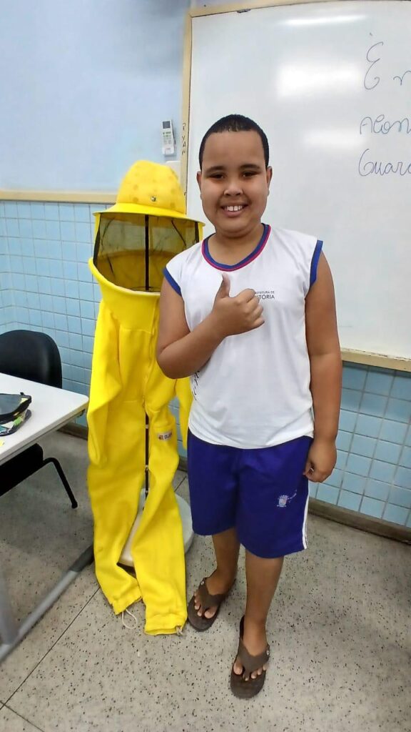 O aluno Weverton dos Santos, 9 anos, do 4º ano, conta que no início ficou com medo, mas gostou muito de participar do projeto. A percepção dele sobre os insetos mudou rapidamente e completamente: “Eu tenho conhecimento de que a abelha é importante para a gente, pois, se não tivesse abelha no mundo, a gente nem estaria aqui hoje. Por isso que comecei a gostar de abelhas”, revela o “Pequeno Guardião”.