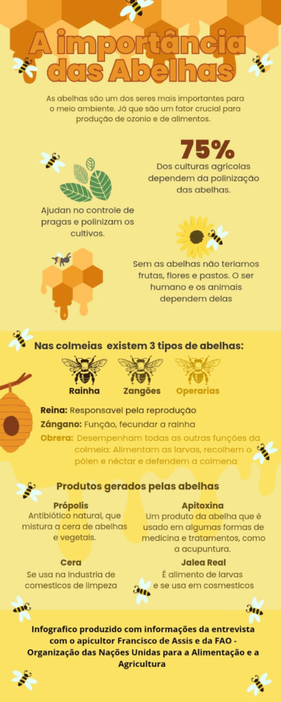 O apicultor Francisco de Assis conta que de fato a polinização das abelhas tem um impacto muito positivo para a biodiversidade e a produção agrícola, ajudando no aumento da produtividade, no peso, na qualidade das frutas e dos grãos, além de estimular uma agricultura sustentável e promover a conservação das matas e dos animais.