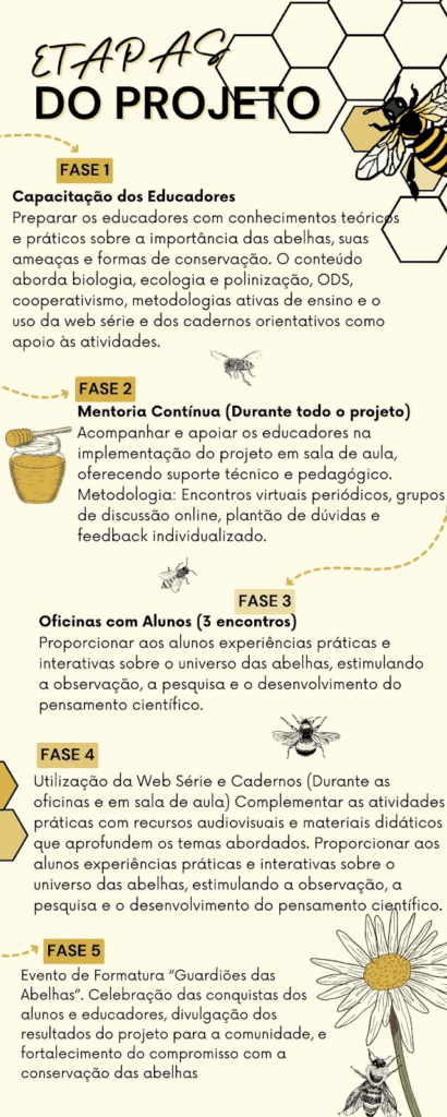 O projeto implementa uma metodologia focada em dois eixos: o fortalecimento do Cooperativismo, usando a organização social que as abelhas seguem como modelo inspirador para o trabalho coletivo e na Sustentabilidade, alinhando as ações aos Objetivos de Desenvolvimento Sustentável (ODS) para promover práticas que garantam segurança alimentar, biodiversidade e um futuro mais equilibrado.